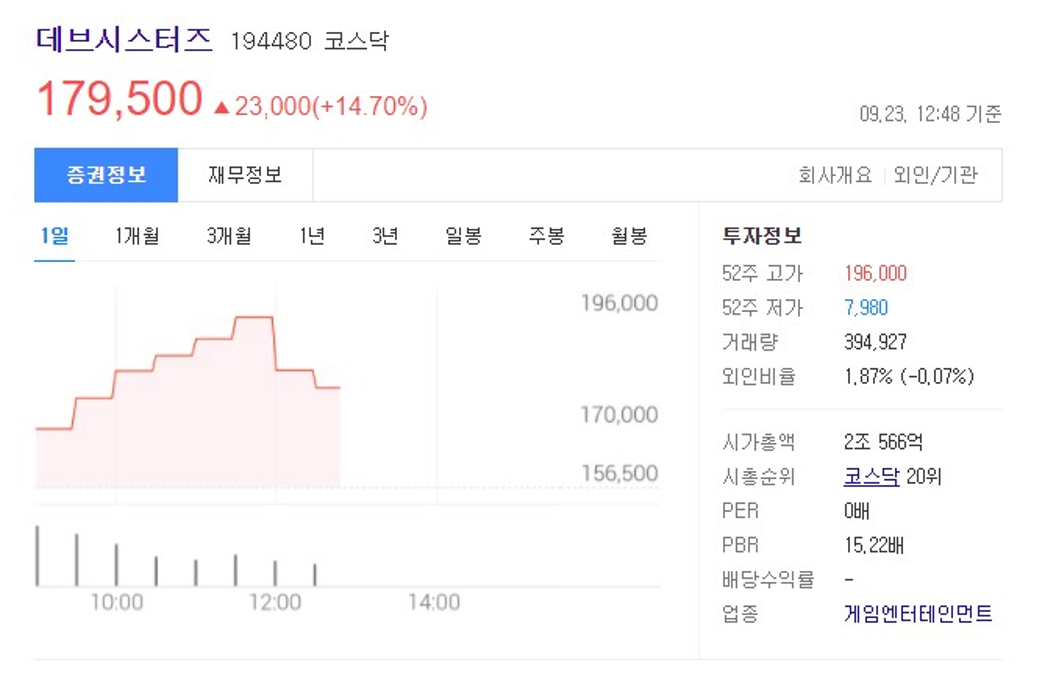 지난 13일부터 강세를 이어나가고 있는 데브시스터즈는 23일 오전 10시 기준 전 거래일 대비 3만 500원 19.49% 상승한 18만 7000원에 거래가가 형성되었다. 데브시스터즈는 지난 13일부터 6 거래일 연속 상승 중이다.