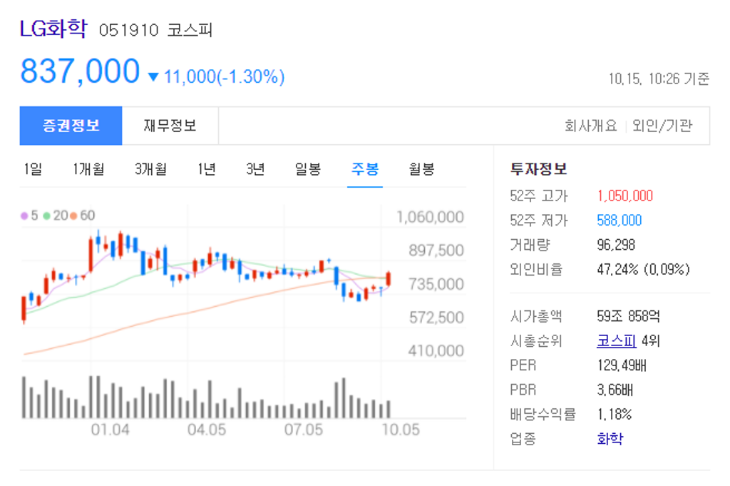 LG화학 주가는 13일 기준 전일 대비 1.51% 오른 80만 8000원으로 장을 마감했다.