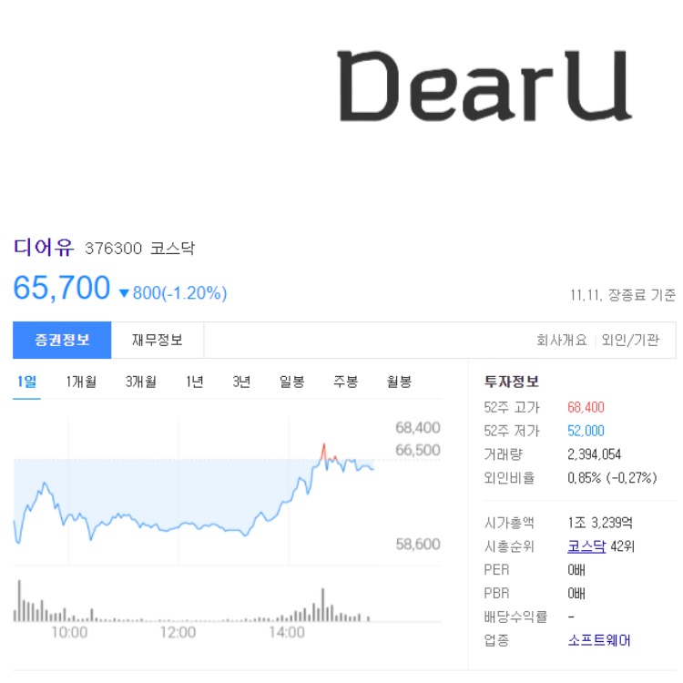 디어유는 상장일은 10일 시초가 대비 27.88% 오른 6만 6500원으로 장을 마감했습니다.